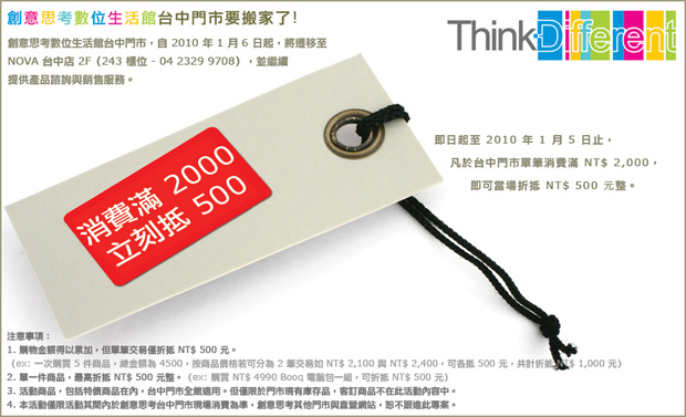 即日起至 2010 年 1 月 5 日止,凡於台中門市(NOVA 台中地下一樓 B46 櫃位)單筆消費滿 NT$ 2,000,即可當場折抵 NT$ 500 元整。