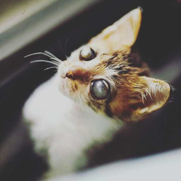 來到新家的第三天,可以看見右眼已經開始萎縮,左眼彷彿覆蓋上一層白白霧面的「龍眼」?經過這幾天醫生的判斷,右眼應該沒機會,等貓咪長大一些後可能要移除。而左眼,應該有機會重見光明。