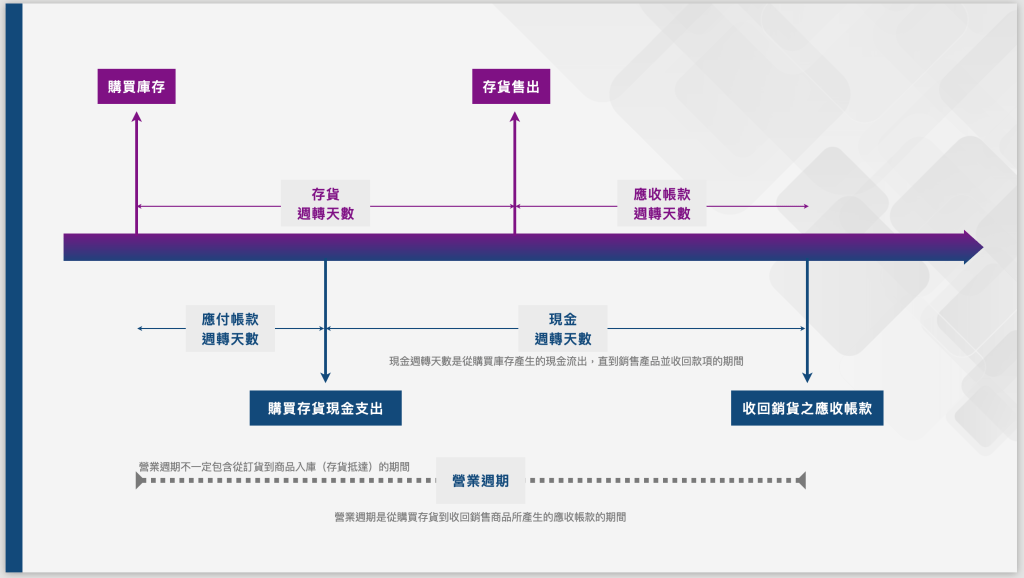 兩張圖一起以時間點來看,營業週期是「從購買存貨到收回銷售商品所產生的應收帳款的期間」。也就是上圖 A + B 的時間點。C 是「應付帳款」的付款週期。以上圖來說:A+B-C 就代表著現金流是否能順利運行關鍵。