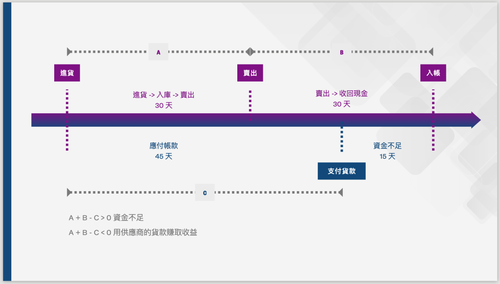 A + B – C = 30 天(需代墊未收賬緩且必須先支付貨款 30 天)