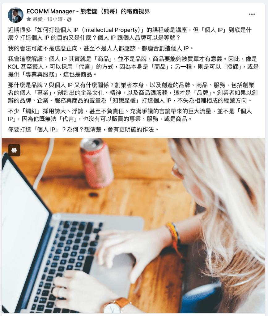 個人 IP,有想法、行動力,甚至有邏輯性的觀點,儘管還沒有「商品與服務」,但確實可以針對某個熟悉、有興趣,甚至有研究的領域中挖掘出自己的觀點與知識,這是值得鼓勵的。但仍舊必須連結上「有價值」的商品或是服務,才能建構「個人 IP 」的成就。因為,如果持續的只靠自己創造流量,恐怕依舊白費力氣,因為 IP 的生命週期實在短暫啊。